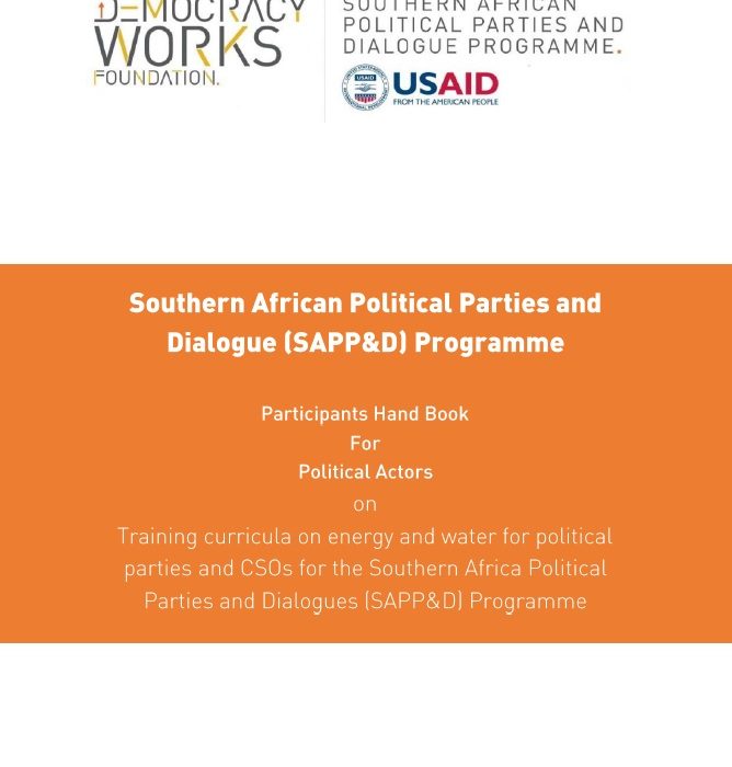 This document is meant for Political Actors to aid them in advocating for formulation of policies that relate to access to renewable clean energy and sustainable clean water. This document is referred to as DWF Toolkit or a Participants handbook/guide. This guide can form a useful tool for Political Actors. As part of the documents that constitute the curriculum on energy and water for political parties and CSOs of the Southern Africa Political Parties and Dialogues (SAPP&D) Programme, this participants handbook is accompanied by a set of Modules that has Facilitators notes to guide the Trainers (DWF Expert Facilitators) on how to portray the content. The content in this participants handbook is mainly made up of the Key points that are listed in the set of modules. Additionally, the Participants Handbook outlines how the Political Actors can influence existing policies, how they can formulate new policies and how they can setup natural resources/water and energy committees in their political parties.
