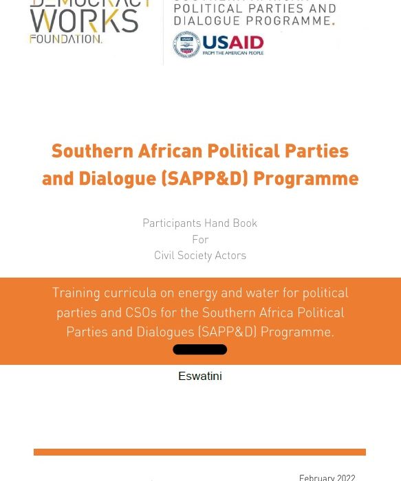 As part of the documents that constitute the curriculum on energy and water for political parties and CSOs for the Southern Africa Political Parties and Dialogues (SAPP&D) Programme, this participants handbook is accompanied by a set of Modules that has Facilitators notes to guide Trainers. The content in this Participants Handbook is mainly made up of the Key points that are listed in the set of modules. Additionally, the Participants Handbook outlines how Civil Society Actors can influence existing policies.
